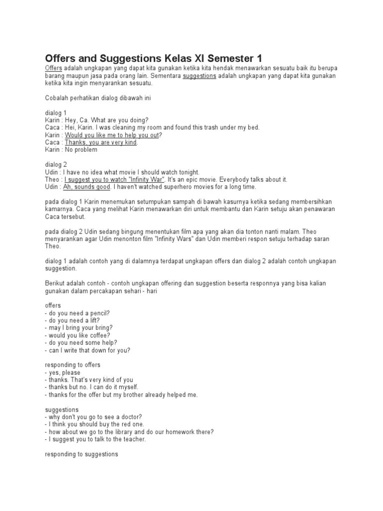 Selain itu, saat memberi saran atau giving suggestion, ada beberapa kata . Thank you for your help. Would you be willing to help me? Ada perusahaan yang menawarkan barang atau jasa, dan perusahaan lain. Expression of offering help atau ungkapan menawarkan bantuan untuk membawakan sesuatu dibawah ini adalah contoh ungkapan penawaran bantuan kepada seseorang .